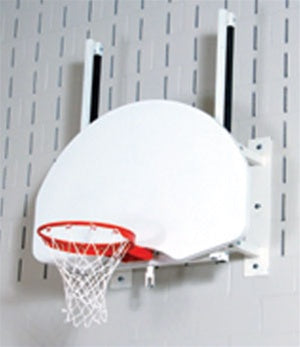 Indoor practice unit that attaches to an interior gym wall. Brackets are supplied painted. Standard colour is black. Other colours are available upon request. Can be used with BB-3 Height Adjustable Adapter Framing. Can be used with Aluminum or Steel backboards. Wall anchors not supplied-can be ordered separately. Illustration shows BB-1- I with a BB-3 Height Adjuster, BB-22 Steel Backboard and BB-30 Goal. BB-3,BB-22,BB-30 must be ordered separately.